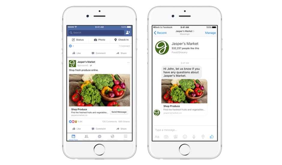 「Messenger 發訊廣告」與常見的Facebook 廣告一樣,都是在Facebook 用戶的「動態消息」的頁面上顯示。若想要用戶傳訊給你的專頁,可考慮將廣告的「行動呼籲按鈕」設置成「發送訊息」,那麼用戶只要點擊廣告的圖片、影片、或按鈕,就會彈到Messenger內開始與你對話。